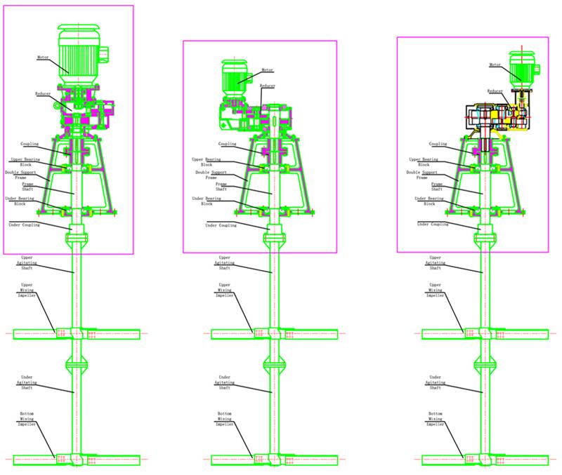 1) Vertikale Mittelrührwerksinstallationsform. Sie zeichnet sich dadurch aus, dass die Rührwelle und das Rührwerk auf der Mittellinie des Rührwerksbehälters angeordnet und symmetrisch angeordnet sind.Der Antriebsmodus ist Riemengetriebe, Zahnradgetriebe oder Verzögerungsgetriebe und wird ebenfalls direkt vom Motor angetrieben.Die Leistung der Mischanlage kann zwischen 0,1 kW und mehreren hundert Kilowatt liegen, der übliche Leistungsbereich liegt zwischen 0,2 und 22 kW.Im Allgemeinen beträgt die Leistung bei kleinen Modellen weniger als 3,7 kW, bei mittleren Modellen 5,5 bis 22 kW und bei großen Modellen mehr als 22 kW.Kleine Mischer werden in der Lebensmittelindustrie eingesetzt.Der Typ mit niedriger Geschwindigkeit liegt unter 100 U/min, der Typ mit mittlerer Geschwindigkeit beträgt 100–400 U/min und der Typ mit hoher Geschwindigkeit beträgt mehr als 400 U/min.Je nach Anwendungsfall kann der Aufbau des Blattes auf vielfältige Weise mit einem dreiblättrigen Propellertyp kombiniert werden.Die Turbine stellt den Hauptkörper dar und kann zu verschiedenen Strukturformen kombiniert werden, um unterschiedlichen Einsatzzwecken gerecht zu werden.Die meisten dieser Mischgeräte wurden im Ausland standardisiert.Der Drehzahlbereich reicht von 300 bis 360 U/min und die Motorleistung von 0,4 bis 15 kW.Der Antrieb erfolgt über eine erste Verzögerungsstufe mit Riemenantrieb oder Zahnradgetriebe.